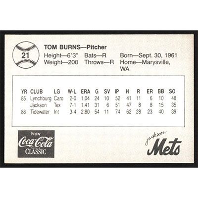 This is a 1987 Jackson Mets Feder Tom Burns baseball card. The card is #21 and pictures show condition.