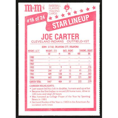 This is a 1987 M&M's Star Lineup Joe Carter baseball card. The card is #16 and pictures show condition.