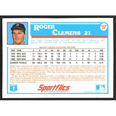 This is a 1987 Sportflics Roger Clemens baseball card. The card is #10 and pictures show condition.