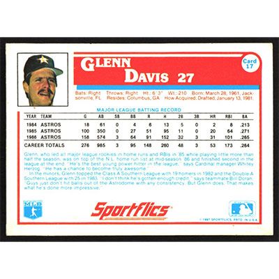 This is a 1987 Sportflics Glenn Davis baseball card. The card is #17 and pictures show condition.
