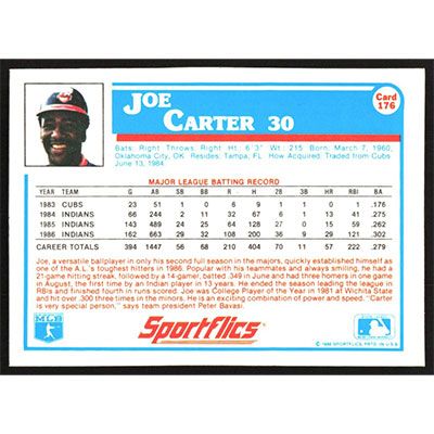 This is a 1987 Sportflics Joe Carter baseball card. The card is #176 and pictures show condition.
