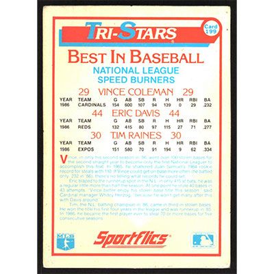 This is a 1987 Sportflics Vince Coleman, Eric Davis and Tim Raines Speed Burners baseball card. The card is #199 and pictures show condition. Team(s): St. Louis Cardinals/Cincinnati Reds/Montreal Expos
