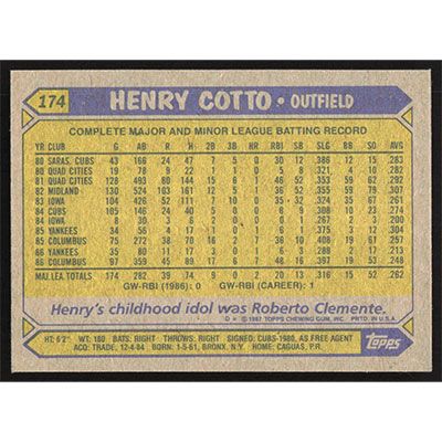 This is a 1987 Topps Henry Cotto baseball card. The card is #174 and pictures show condition.
