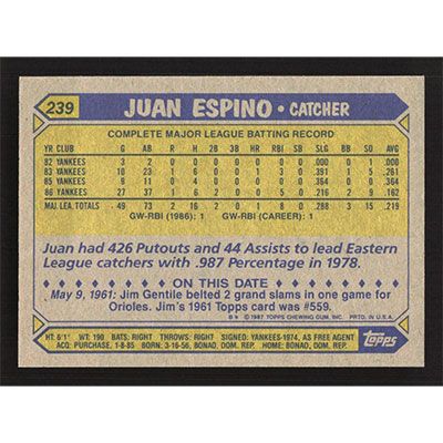 This is a 1987 Topps Juan Espino baseball card. The card is #239 and pictures show condition.