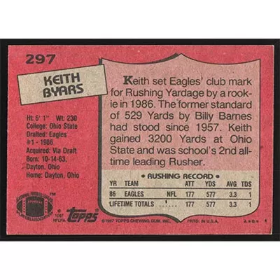 This is a 1987 Topps Keith Byars football card. The card is #297 and pictures show condition.