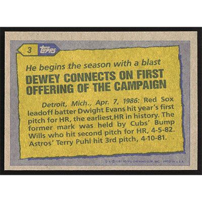 This is a 1987 Topps Dwight Evans Record Breaker baseball card. The card is #3 and pictures show condition.