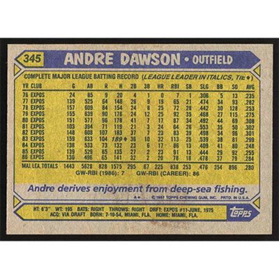 This is a 1987 Topps Andre Dawson baseball card. The card is #345 and pictures show condition.