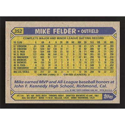 This is a 1987 Topps Mike Felder baseball card. The card is #352 and pictures show condition.