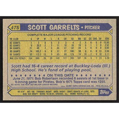 This is a 1987 Topps Scott Garrelts baseball card. The card is #475 and pictures show condition.