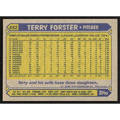 This is a 1987 Topps Terry Forster baseball card. The card is #652 and pictures show condition.