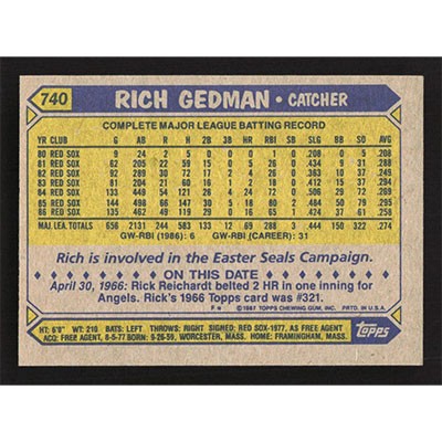This is a 1987 Topps Rich Gedman baseball card. The card is #740 and pictures show condition.
