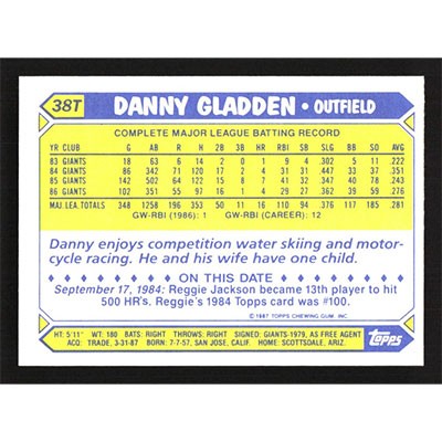 This is a 1987 Topps Traded Tiffany Danny Gladden baseball card. The card is #38T and pictures show condition.