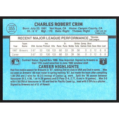 This is a 1988 Donruss Chuck Crim baseball card. The card is #355 and pictures show condition.