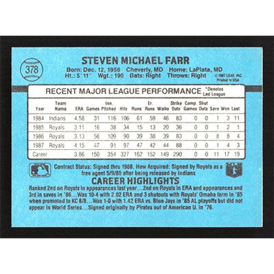 This is a 1988 Donruss Steve Farr baseball card. The card is #378 and pictures show condition.