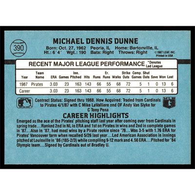 This is a 1988 Donruss Mike Dunne baseball card. The card is #390 and pictures show condition.
