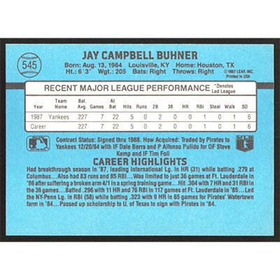 This is a 1988 Donruss Jay Buhner baseball card. The card is #545 and pictures show condition.