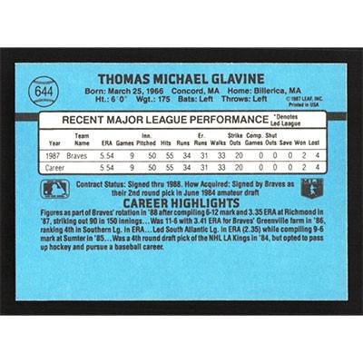 This is a 1988 Donruss Tom Glavine baseball card. The card is #644 and is in NM-MT condition.