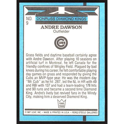 This is a 1988 Donruss Andre Dawson Diamond Kings baseball card. The card is #9 and pictures show condition.