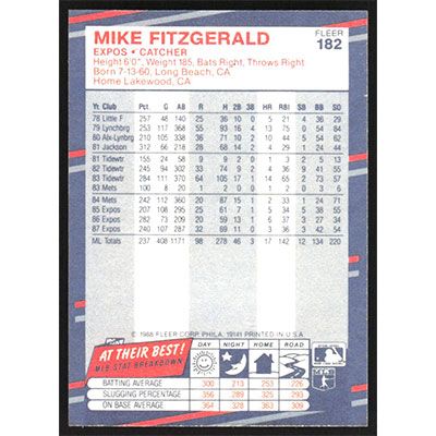 This is a 1988 Fleer Mike Fitzgerald baseball card. The card is #182 and pictures show condition.