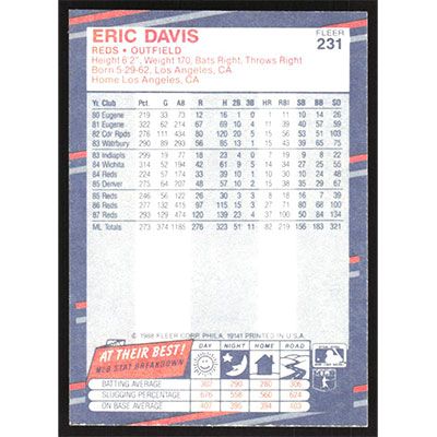 This is a 1988 Fleer Eric Davis baseball card. The card is #231 and pictures show condition.