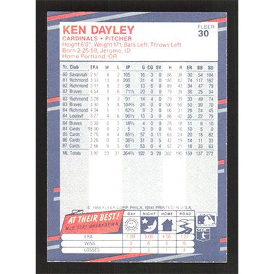 This is a 1988 Fleer Ken Dayley baseball card. The card is #30 and pictures show condition.