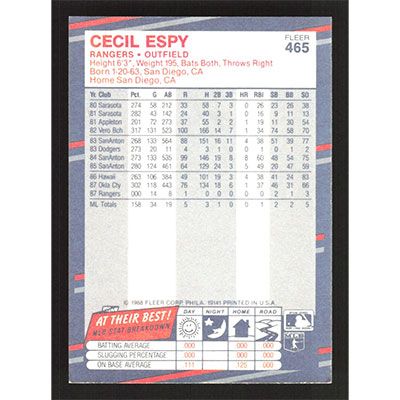 This is a 1988 Fleer Cecil Espy baseball card. The card is #465 and pictures show condition.