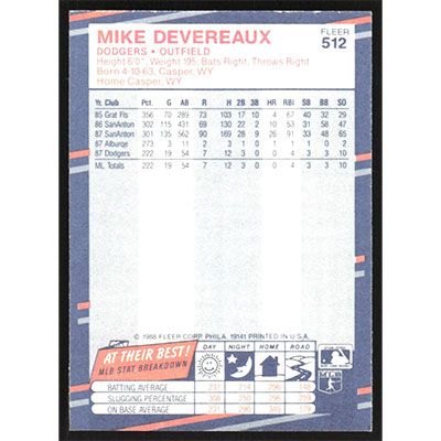 This is a 1988 Fleer Mike Devereaux baseball card. The card is #512 and pictures show condition.