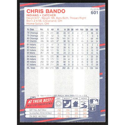 This is a 1988 Fleer Chris Bando baseball card. The card is #601 and pictures show condition.