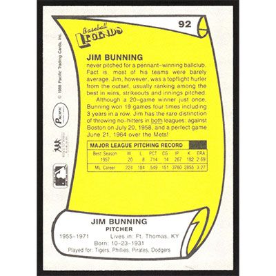 This is a 1988 Pacific Legends I Jim Bunning baseball card. The card is #92 and pictures show condition.
