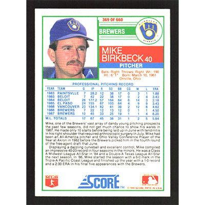 This is a 1988 Score Mike Birkbeck baseball card. The card is #369 and pictures show condition.