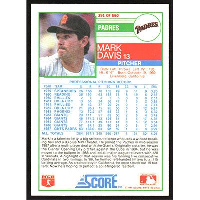 This is a 1988 Score Mark Davis baseball card. The card is #391 and pictures show condition.