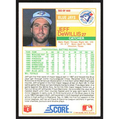 This is a 1988 Score Jeff DeWillis baseball card. The card is #583 and pictures show condition.