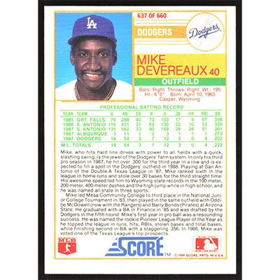 This is a 1988 Score Mike Devereaux autographed baseball card. This card has been signed, in blue, by Mike Devereaux, and is guaranteed authentic by Ballcardz.com. The card is #637 and pictures show condition.