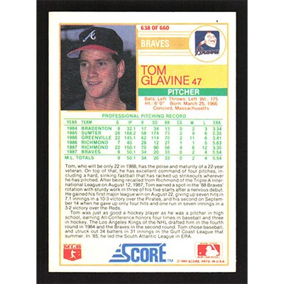 This is a 1988 Score Tom Glavine baseball card. The card is #638 and pictures show condition.