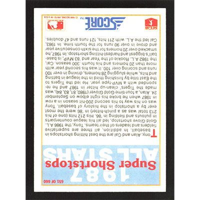 This is a 1988 Score Tony Fernandez, Cal Ripken Jr. and Alan Trammell Super Shortstops baseball card. The card is #651 and pictures show condition. Team(s): Toronto Blue Jays/Baltimore Orioles/Detroit Tigers