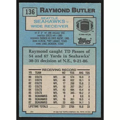 This is a 1988 Topps Raymond Butler football card. The card is #136 and pictures show condition.