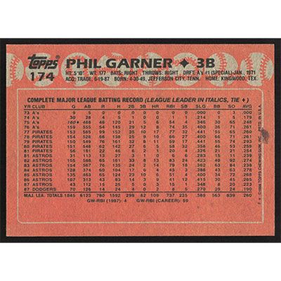 This is a 1988 Topps Phil Garner baseball card. The card is #174 and pictures show condition.