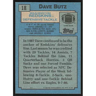 This is a 1988 Topps Dave Butz football card. The card is #18 and pictures show condition.