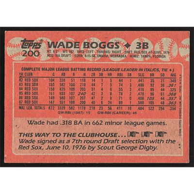 This is a 1988 Topps Wade Boggs baseball card. The card is #200 and pictures show condition.
