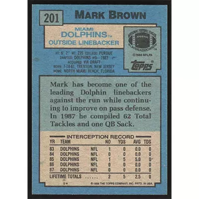 This is a 1988 Topps Mark Brown football card. The card is #201 and pictures show condition.