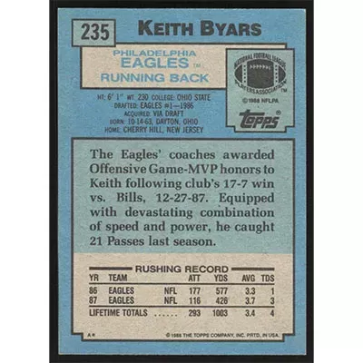 This is a 1988 Topps Keith Byars football card. The card is #235 and pictures show condition.