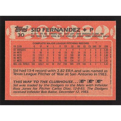 This is a 1988 Topps Sid Fernandez baseball card. The card is #30 and pictures show condition.