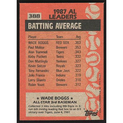This is a 1988 Topps Wade Boggs All-Star baseball card. The card is #388 and pictures show condition.