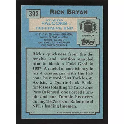 This is a 1988 Topps Rick Bryan football card. The card is #392 and pictures show condition.