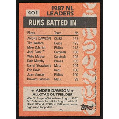 This is a 1988 Topps Andre Dawson All-Star baseball card. The card is #401 and pictures show condition.