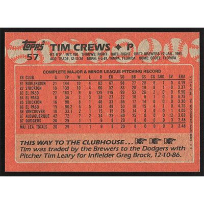 This is a 1988 Topps Tim Crews baseball card. The card is #57 and pictures show condition.