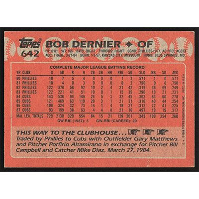 This is a 1988 Topps Bob Dernier baseball card. The card is #642 and pictures show condition.