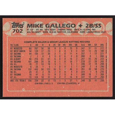 This is a 1988 Topps Mike Gallego baseball card. The card is #702 and pictures show condition.