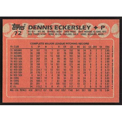 This is a 1988 Topps Dennis Eckersley baseball card. The card is #72 and pictures show condition.