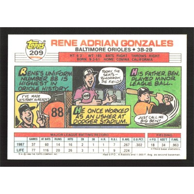 This is a 1988 Topps Big Rene Gonzales baseball card. The card is #209 and pictures show condition.